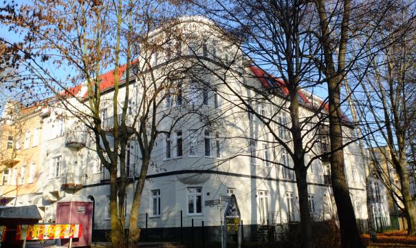 Das um 1905 gebaute, fünfgeschossige Eckhaus besteht aus zwei Vorderhäusern un